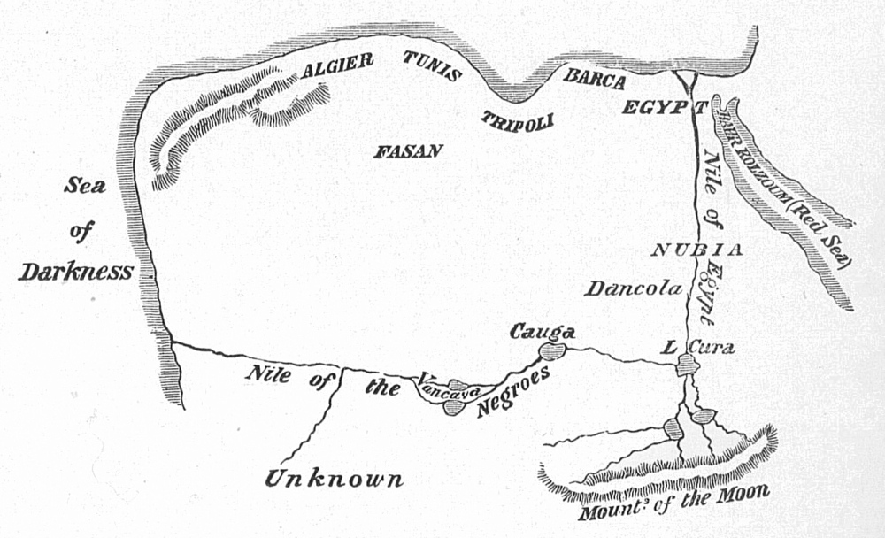 Père Jerome Lobo and the Nile—The chartographers of Homer’s time—Hekatæus’s ideas of Africa—Africa after Hipparchus—The great Ptolemy’s map—Edrisi’s map—Map of the Margarita Philosophica—Map of John Ruysch—Sylvannus’ map—Sebastian Cabot’s map—The arbitrariness of the modern map maker—Map of Constable, Edinburgh—What Hugh Murray says in his book published in 1818—A fine dissertation on the Nile by Father Lobo—Extracts from part of a MS. in the possession of H. E. Ali Pasha Moubarek—Plan of Mount Gumr—A good description of Africa by Scheabeddin—The Nile according to Abdul Hassen Ali—Abu Abd Allah Mohammed on the Nile river | 291 |
