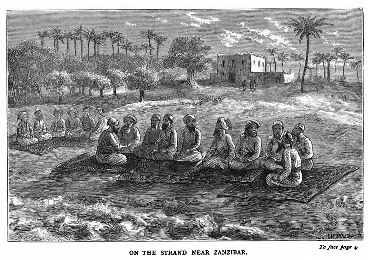 The Arab chiefs and their followers, though they generally take a long time to prepare a caravan, were in this instance, however, much to our pleasure, punctual to the day named, and at the beginning of the new moon of the sixth month of the year of the glorious Hegira 128-, or the year of our Lord and Saviour Jesus Christ 186-, the ships containing the expedition and the vast amount of stores requisite for the consumption of a large and imposing caravan for about three years, set sail in the morning from the open harbour of Zanzibar, for the port of Bagamoyo, on the mainland, distant twenty-five miles.