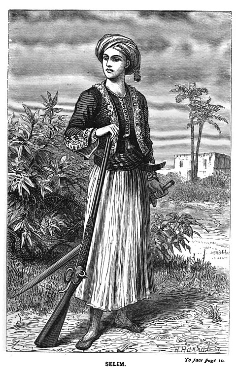 Close to this group of elderly and noble-looking Arabs was another consisting of young people who were the sons or near relatives of each of the Arabs above-mentioned. There were Suleiman and Soud, nephews of Amer bin Osman, gaudily-dressed youths; there was Isa, a tall dark-coloured boy, son of Sheikh Thani; there were Abdullah and Mussoud, two boys of fourteen and twelve years respectively, sons of Sheikh Mohammed, whose complexions were as purely white as black-eyed descendants of Ishmael can well be; and lastly, there was the beloved son of Amer, son of Osman—Selim, whose appearance at once challenged attention from his frank, ingenuous, honest face, his clear complexion, his beautiful eyes, and the promise which his well-formed graceful figure gave of a perfect manhood in the future.