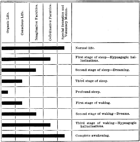 Sleep is usually preceded for some time by a feeling of sleepiness. This sensation, like the analogous sensations of hunger and thirst, represents in some measure the progressive diminution of energy throughout the entire body; but it is chiefly expressive of the failure of cerebral energy. It produces a sense of general heaviness and intellectual dullness; the special senses become less alert, the eyelids droop, numerous groups of muscles experience the spasmodic contraction of yawning, the head drops forward and is recovered with a jerk, the limbs relax, and the whole body tends to assume a position convenient for repose. Every school-boy who has been compelled to pass an evening hour at a dull lecture, under the eye of a martinet monitor, will testify to the suffering which attends any unusual prolongation of this period. But, if the natural course of events be not obstructed, the stage of mere sleepiness is soon passed, and the introductory stage of sleep is entered. This is a state in which the individual is neither awake nor fully asleep. It is known as the hypnagogic state. During this period the phenomena of simple sleepiness become exaggerated to such a degree that the attitude of repose is assumed without effort if the body be permitted to follow the natural inclination of its different members. The eyes close, the other senses become inactive, though the sense of hearing is the most[Pg 3] persistent. Released in considerable measure from the control of the brain, the reflex energy of the spinal cord is at first somewhat exalted. Witness the fibrillary twitching of the muscles, and the convulsive state, which may often be observed during the stage of somnolence after severe fatigue. The uneasy sleeper may even be roused to complete wakefulness by such involuntary movements. But, as sleep becomes more profound, the reflex functions of the cord are also weakened.[1] As the sensory organs retire from action, the intellectual faculties lose their equilibrium. First, the power of volition ceases. Then the logical association of ideas comes to an end. The reasoning faculty disappears, and judgment is suspended. We become, therefore, no longer capable of surprise or astonishment at the vagaries of memory and of imagination, the only faculties that remain in action. To their more or less unfettered activity we owe the presentation in consciousness of those disorderly pictures which, occurring in this stage of imperfect sleep, have been termed hypnagogic hallucinations.[2] During the early moments of this period an observant person may often retain a power of reasoning sufficient to remark the fact of dreaming, and this effort of attention may produce a partial awakening; but, usually, the subsidence of cerebral function is progressive and rapid. The fire of imagination fades, the field of consciousness becomes less and less vividly illuminated, the entire nervous apparatus yields to the advancing tide, and, finally, the dominion of sleep is fully[Pg 4] confirmed. The sleeper knows nothing of the external world, and has lost all consciousness of his own existence. But the duration of profound repose is brief. From the end of the first hour the depth of sleep, at first, rapidly, then, more gradually, subsides. Dreams disturb its tranquility, mental activity increases, the power of volition revives, and, at the end of six or eight hours, the individual is once more awake. The subjoined diagram, borrowed from the Dictionaire Encyclopédique des Sciences Médicales, will facilitate the apprehension of these successive phases in the course of sleep: