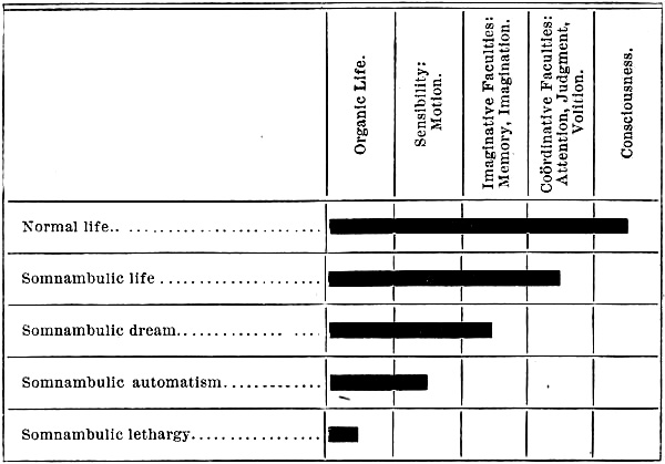 Causes of somnambulism — Physiology of somnambulism — Varieties of the disorder — Maury’s classification — Classification of Ball and Chambard — Diagrammatic representation of their classification — Somnambulic lethargy — Illustrative cases — Somnambulic dreams — Night terrors — Somnolentia or sleep-drunkenness — Sleep-walking — Illustrative cases — Condition of the special senses in somnambulism — Relation of memory to the somnambulic paroxysm — Illustrative cases — Occasional recollection of incidents connected with the somnambulic dream — Resemblances between the somnambulic state and the condition of post-epileptic mania — Somnambulic visions — J. P. Frank’s case — Mesnet’s case — Somnambulic life — Its likeness with the double-consciousness of certain forms of epilepsy — Illustrative cases — General theory of somnambulism. 166