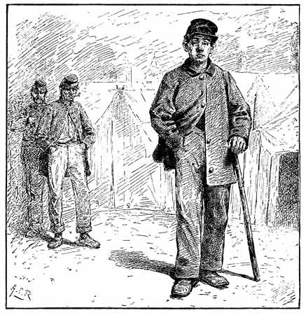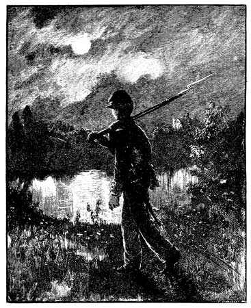 Down through the streets of Baltimore we march the next day, with our blackened and tattered flags a-flying, mustering only one hundred and eighty men out of the one thousand who marched through those same streets nearly three years before. We find a train of cars awaiting us, which we gladly enter, making no complaint that we are stowed away 327 in box or cattle cars, instead of passenger coaches, for we understand that Uncle Sam cannot afford any luxuries for his boys, and we have been used to roughing it. Nor do we complain, either, that we have no fire, although we have just come out of a warm climate, and the snow is a foot deep at Baltimore, and is getting deeper every hour as we steam away northward. Toward evening we pass Harrisburg, giving "three cheers for Andy Curtin," as the State Capitol comes in sight. Night draws on, and the boys one by one begin to bunk down on the floor, wrapped in their great-coats and blankets. But I cannot lie down or sleep until we have passed a certain way-station, from which it is but two miles across the hills to my home. I stand at the door of the car, shivering and chilled to the bone, patiently waiting and watching as village after village rushes by in the bright moonlight, until at long last we reach the well-known little station at the hour of midnight. And then, as I look across the snow-clad moonlit hills, toward the old red farmhouse where father and mother and sisters are all sleeping soundly, with never a thought 328 of my being so near, I fall to thinking, and wondering, and wishing with a bounding heart, as the train dashes on between the mountain and the river, and bears me again farther and farther away from home. Then rolling myself up in my blanket, and drawing the cape of my overcoat about my head, I lie down on the car floor beside Andy, and am soon sound asleep.