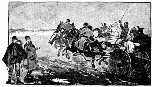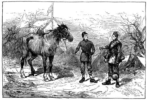 When darkness came, the scene presented by that long line of burning ties was wild and weird. Rain and sleet had been falling all day, and there was frost as well, and we lay down at night with stiff limbs, aching bones, and chattering teeth. Everything was covered with a coating of ice; so that Andy and I crept under a wagon for shelter and a dry spot to lie down in. But the horses, tied to the wheels, gave us little sleep. Scarcely would we fall into a doze, when one of the horses would poke his nose between the wheels, or through the spokes, and whinny pitifully in our ears. And no wonder, either, we thought, when, crawling out at daybreak, we found the poor creatures covered with a coating of ice, and their tails turned to great icicles. The trees looked very beautiful in their magnificent frost-work; but we were too cold and wet to admire anything, as our drums hoarsely beat the "assembly," and we set out for a two days' wet and weary march back to camp in front of Petersburg.