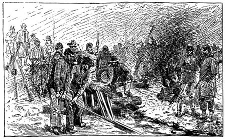 About the beginning of December, 1864, we were busy building cabins for the winter. Everywhere in the woods to our rear were heard the sound of axes and the crash of falling trees. Men were carrying pine-logs on their shoulders, or dragging them along the ground with ropes, for the purpose of building our last winter-quarters; for of the three years for which we had enlisted, but a few months remained. The camp was a scene of activity and interest on all sides. Here were some men "notching" the logs to fit them firmly together at the corners; yonder, one was hewing rude Robinson Crusoe boards for the eaves and gables; there, a man was digging clay for the chimney, which his messmate was cat-sticking up to a proper height; while some had already stretched their shelters 315 over rude cabins, and were busy cooking their suppers. Just then, as ill-luck would have it in those uncertain days, an orderly rode into camp with some orders from headquarters, and all building was directed to be stopped at once.