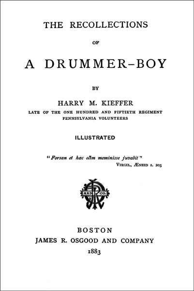 Several years ago the writer prepared a brief series of papers for the columns of St. Nicholas, under the title of "Recollections of a Drummer-Boy." It was thought that these sketches of army life, as seen by a boy, would prove enjoyable and profitable to children in general, and especially to the children of the men who participated in the great Civil War, on one side or the other; while the belief was entertained that they might at the same time serve to revive in the minds of the veterans 4 themselves long-forgotten or but imperfectly remembered scenes and experiences in camp and field. In the outstart it was not the author's design to write a connected story, but rather simply to prepare a few brief and hasty sketches of army life, drawn from his own personal experience, and suitable for magazine purposes. But these, though prepared in such intervals as could with difficulty be spared from the exacting duties of a busy professional life, having been so kindly received by the editors of St. Nicholas, as well as by the very large circle of the readers of that excellent magazine, and the writer having been urgently pressed on all sides for more of the same kind, it was thought well to revise and enlarge the "Recollections of a Drummer-Boy," and to present them to the public in permanent book form. In the shape of a more or less connected story of army life, covering the whole period of a soldier's experience from enlistment to muster-out, and carried forward through all the stirring scenes of camp and field, it was believed that 5 these "Recollections," in the revised form, would commend themselves not only to the children of the soldiers of the late war, but to the surviving soldiers themselves; while at the same time they would possess a reasonable interest for the general reader as well.
