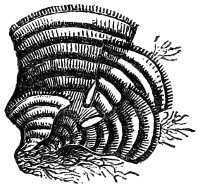 The Whelks belong to the interesting family Muricidæ, some of which, natives of our own coasts, are very pretty objects for the Aquarium. It was the Murex trunculus which yielded the Tyrian 78purple, different species affording distinct tones of colour. In form, these shells are somewhat like our common Whelk, but finely marked with broad, dark, spiral stripes. The ancient mode of extracting the dye, as described by Pliny, was verified by Mr. Wild, in 1838, in a very interesting manner. In the neighbourhood of the site of the ancient Tyre, he found, in the rocks on the sea-shore, a vast number of round cavities, evidently the work of the hammers and chisels of long ages past. These cavities varied in size, from that of a small flower-pot to that of a cauldron, and round about them still lay scattered immense masses of the remains of the shells and bodies of the Murex, in many instances aggluminated together. They had evidently been pounded in those cavities, exactly as described by Pliny, and the dye extracted according to the formulæ so graphically detailed by the ancient naturalist.