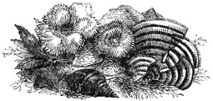 The Balani, or Acorn-shells, which are generally parasitic, fixing themselves to the shell of the Whelk or some other univalve, spread their crimson tentacles when seeking food exactly in the manner of the Serpulæ, the feathery filaments forming a kind of living casting-net, as it has been observed, in which the minute Annelid or Infusory is entangled and devoured. Two Balani are represented in Plate VII. on the shell of a common Whelk.