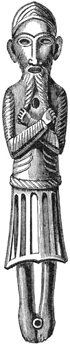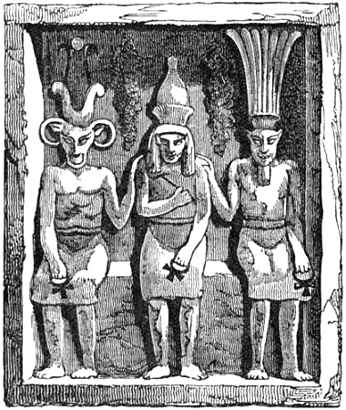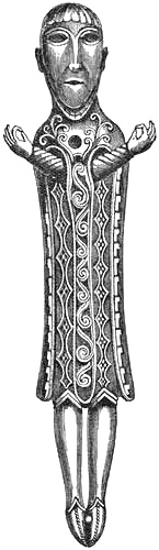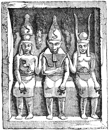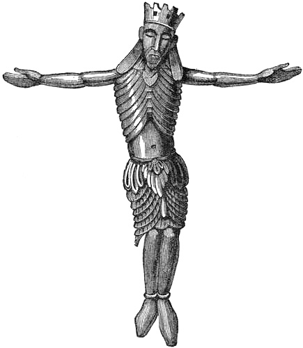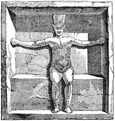 A striking instance of the resemblance between the Nubian and Knockmoy sculptures consists in the attire of the principal figures. In both the philibeg, or kilt, is worn; and this peculiarity is reproduced in idols of the Irish pagan god, Phearagh, or Farragh, or Budh, which have been from time to time exhumed. The headdresses and collars also correspond. In Buddhist Indian mythology Deva Thot is represented as crucified; in fact, the expectation of salvation through the atonement of a crucified Mediator characterises the whole system of pagan (Sabaic) beliefs as thoroughly as it did Hebraism. It is expressed in one of the names of Ireland, namely, Criach-na-Fuineadhach (meaning the asylum of the expectants, or the retreat of those looking forward), which was given to that country long before the advent of Christianity.
