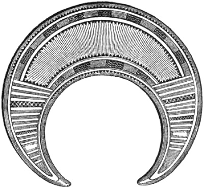 Although the Persian historians maintain silence, the evidence of other authorities in support of this episode is not wanting. For instance, when referring to Buddha, Oriental writers agree that he was born in Maghada; also that he was the son of Suad-de-dana—Suad being convertible with Tuath, and both resolvable into Budh. Without professing to map out the exact route by which the Tuath-de-danaans made their way to Ireland, the author maintains that the fact of their having occupied that country for a considerable time is incontrovertible. As for their rivals, the Pish-de-danaans, it has already been stated that they, in their turn, had to leave Persia when Kaimours was called to the throne; and the presumption is that they were identical with those Uksi, or Shepherd Kings, who overran Egypt, and to whom the erection of pyramids emblematical of the female nature is ascribed. Their distinctive views may, it is pointed out, have prevailed among them from the time when they formed a portion of the Noachidæ; for the “Ark” was typical of the dominant idea in their belief, and the same idea was typified under another form in the pyramids. A variant symbol of this idea is the crescent (or lunar boat), of which certain Irish ornaments are representative. It is further possible that the Pish-de-danaan tradition of the deluge may have been communicated to Moses during his stay in[Pg lii] Egypt, and that the narrative is more figurative than historical.