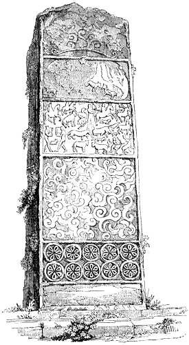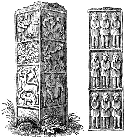 [576] See p. 361. At Monasterboice there are three very beautiful specimens of those Tuath-de-danaan crosses still remaining, and covered, as usual, with hieroglyphic sculpture. “The pillars in the Palencian city,” I find, “are also decorated with serpents, lizards, etc.”