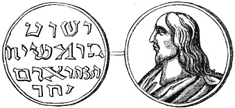 [603] “The countenance of Christ was placid, handsome, and ruddy, so formed, however, as to inspire the beholders, not so much with love and reverence as with terror; his locks were like the colour of a full ripe filbert nut (auburn), straight, and entire down to the ears, from thence somewhat curled down to the shoulders, but parted on the crown of the head after the manner of the Nazarites; his forehead was smooth and shining, his eyes blue and sparkling, his nose and mouth decorous, and absolutely faultless; his beard, in colour like his locks, was forked, and not long” (Waserus, p. 63).
