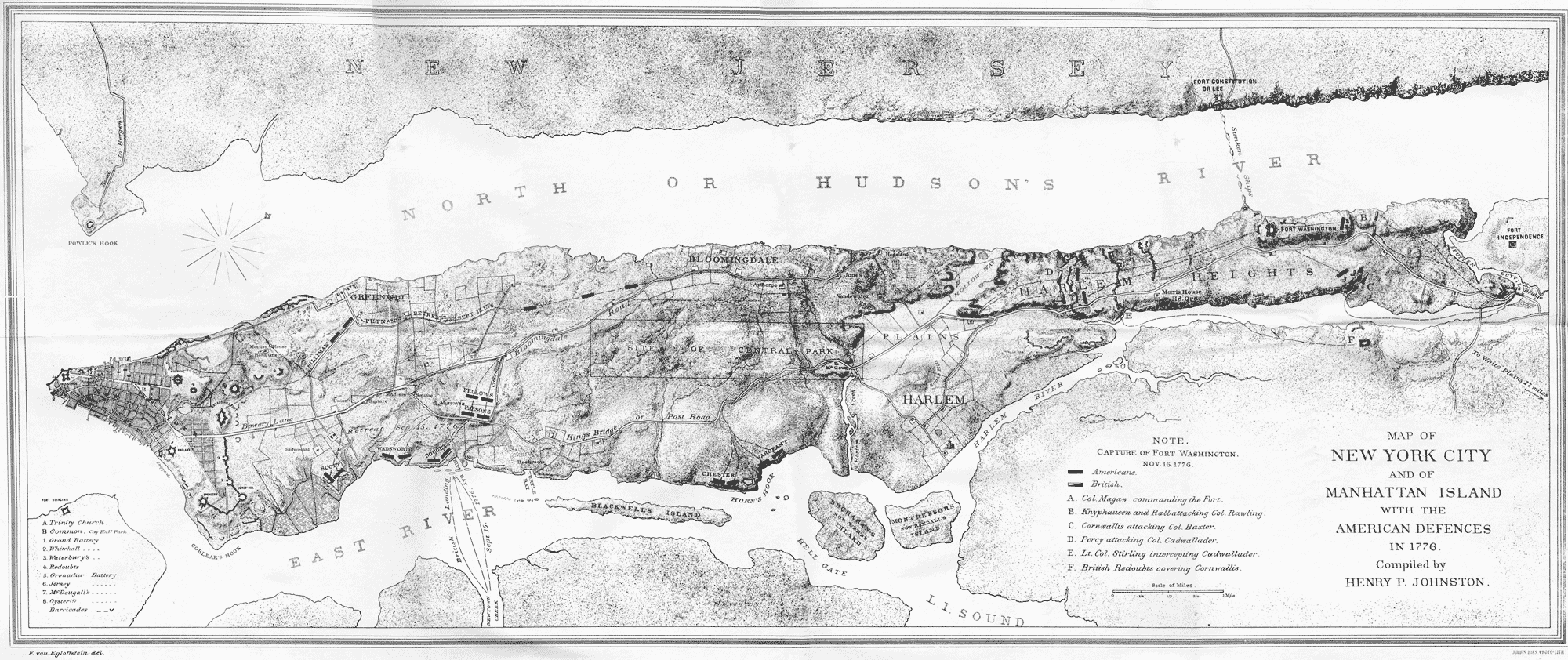The Battle-field.—Recently gathered material seems to settle all doubts as to the several points occupied by the British and Americans during the action. Where did it begin and where did it end? As to the first skirmish, it began near the British encampment at Bloomingdale. Here was Howe's left, and, as Howe reports, Knowlton approached his advanced posts under cover of the woods "by way of Vandewater's Height." This was what we call Bloomingdale Heights. The original proprietor of the greater part of this site was Thomas De Key. From him all or a large part of it passed to Harman Vandewater and Adrian Hogeland, as the deeds on record show. In 1784 the property was purchased by Nicholas De Peyster. The position of Hogeland's and Vandewater's houses as given on the accompanying map is taken from old surveys which mark the location and give the names. The Bloomingdale Road at that time stopped at these farms. That part of it above One Hundred and Tenth Street, running through Manhattanville and continuing until recently to the King's Bridge Road at One Hundred and Forty-sixth Street, did not exist during the Revolution, but was opened a few years later. (Hoffman's Est. and Rights of the Corporation of New York, vol. ii.) A lane or road running from Hogeland's by Vandewater's connected the Bloomingdale with the King's Bridge road at One Hundred and Nineteenth Street. Washington himself gives us the general line. Before the battle of Long Island he ordered Heath to have troops ready to march to New York as soon as called for, and he describes the proper route thus: "There is a road out of the Haerlem flat lands that leads up to the hills, and continues down the North River by Bloomingdale, Delancy's, &c., which road I would have them march, as they will keep the river in sight, and pass a tolerable landing-place for troops in the neighborhood of Bloomingdale." (Heath Correspondence, Mass. Hist. Coll. for 1878.) From this topography and the records the position becomes clear: Howe camped around Bloomingdale with his advance posts along the Bloomingdale Road, perhaps as far as its terminus near Hogeland's. They were last seen in this vicinity the night before. Knowlton, next morning, marches out from Harlem Heights, reconnoitres "by way of Vandewater's," and comes upon the British posts on and along the line of the Bloomingdale Road. Then he falls back under cover of the woods and over fences towards the Point of Rocks, the enemy following him.