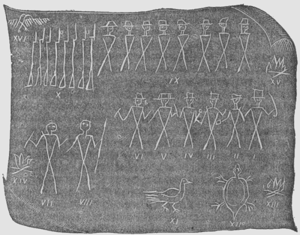 A good deal of historical interest clusters about this discovery of the inscribed stone. Tomlinson, the grandfather, settled on these flats in 1772, two years before the murder of Logan’s family. Large trees, as large as any in the forest, then covered the flats and the mound. There stood in the depression I have mentioned, in the top of the mound, a large beech tree, which had been visited earlier, as was shewn by several names and dates cut on the bark. Among these, there was one of the date of A. D. 1734. This I have seen stated under Mr. Tomlinson’s own hand. The place continued to be much visited from 1770 to 1790, as was shewn by newer names and dates, and indeed, continues to be so still. There was standing at the time of my first visit in 1818, on the very summit of the mound, a large dead or decayed white oak, which was cut down, it appears, about ten years afterwards. On counting its cortical layers, it was ascertained to be about 500 years old. This would denote the desertion of the mound to have happened about the commencement of the 13th century. Granting to this, what appears quite clear, that the inscription is of European origin, have we not evidence, in this fact, of the continent’s having been visited prior to the era of Columbus? Visited by whom? By a people, or individuals, it may be said, who had the use of an antique alphabet, which was much employed, (although corrupted, varied and complicated by its spread) among the native priesthood of the western shores and islands of the European continent, prior to the introduction of the Roman alphabet.