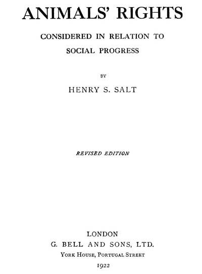 It may be taken, perhaps, as a sign of the extension of humane ideas that, since its first appearance in 1892, this essay on “Animals’ Rights” has passed through numerous editions, and has been translated into French, German, Dutch, Swedish, and other European tongues.