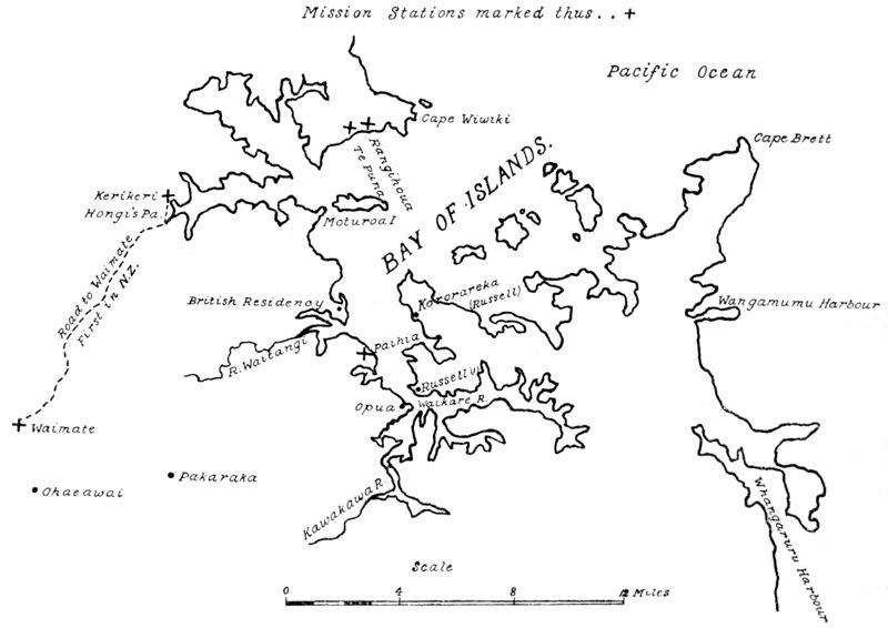 Position of settlers—Hall at Waitangi—Communistic experiment—Difficulty with Kendall—The mission in trouble—Visit of Rev. S. Leigh—Renewed zeal—Second visit of Marsden—Foundation of Kerikeri station[xiv]—Marsden's third visit—Hongi and Kendall leave for England—Reception by King George IV—Marsden's journeys in New Zealand—Hinaki of Mokoia—Return of Hongi and Kendall—Change in Hongi—Siege of Mokoia—Devastation of Thames district—Miserable plight of missionaries—Closing of seminary at Parramatta.