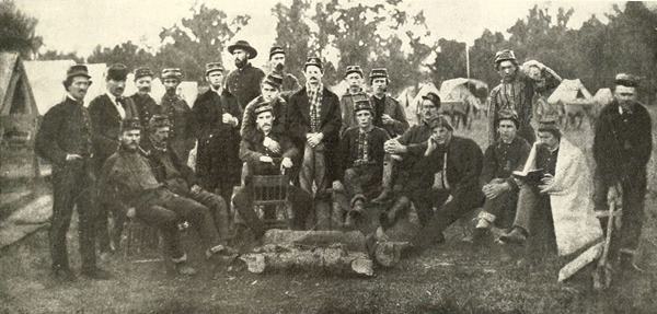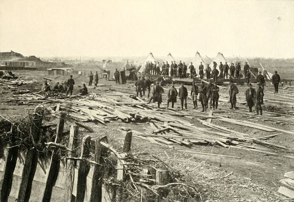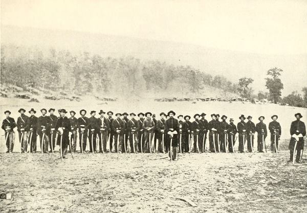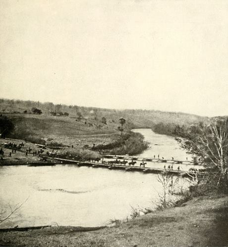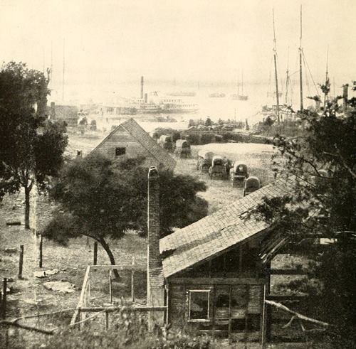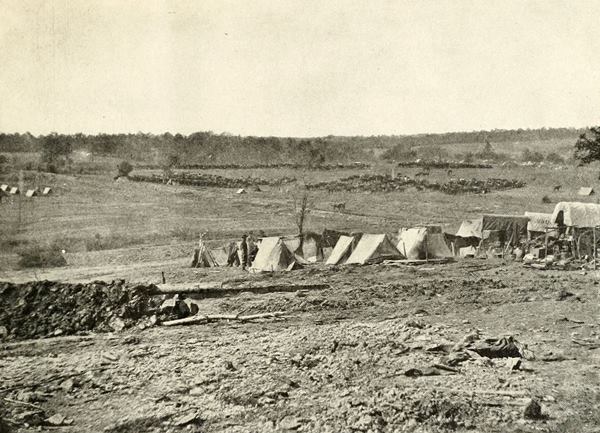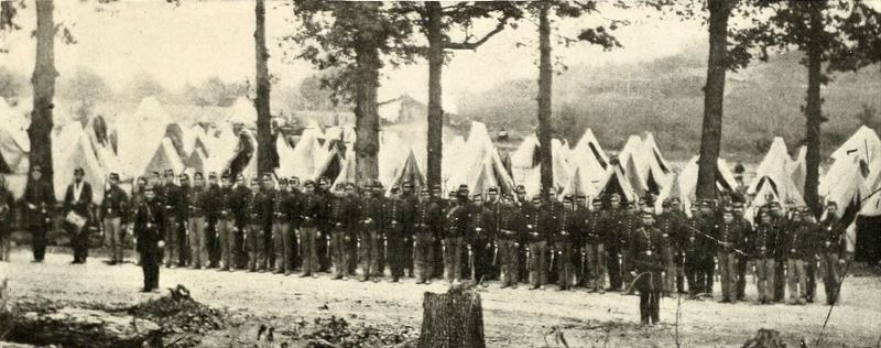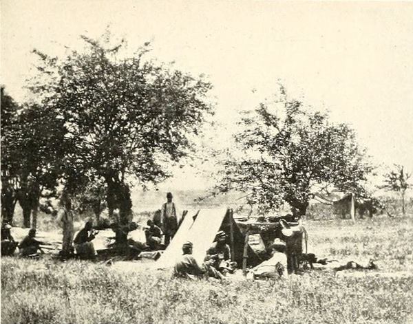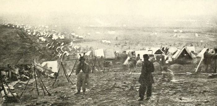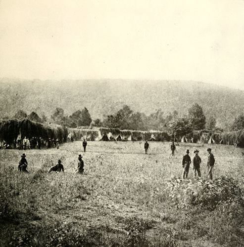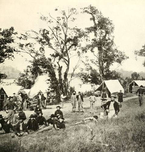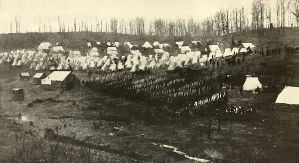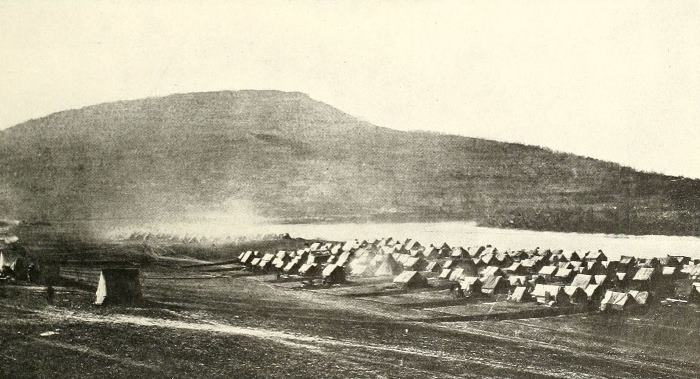When Thomas began to draw together his forces to meet Hood at Nashville, he ordered the garrison at Johnsonville, on the Tennessee, eighty miles due west of Nashville, to leave that place and hasten north. It was the garrison at this same Johnsonville that, a month earlier, had been frightened into panic and flight when the bold Confederate raider, Forrest, appeared on the west bank of the river and began a noisy cannonade. New troops had been sent to the post. They appear well coated and equipped. The day after the photograph was taken (November 23d) the encampment in the picture was broken.