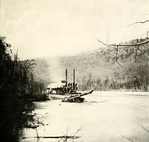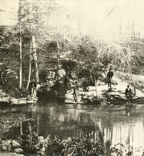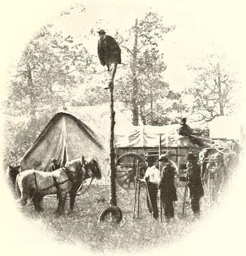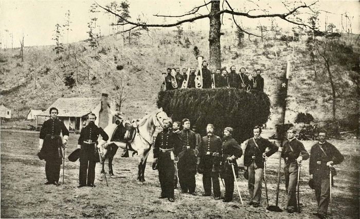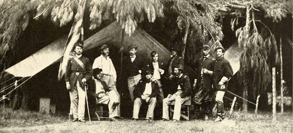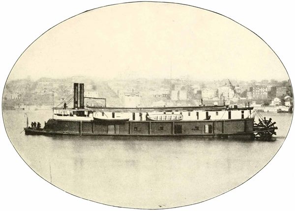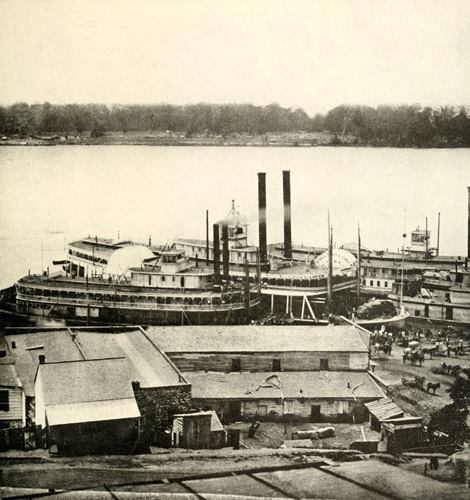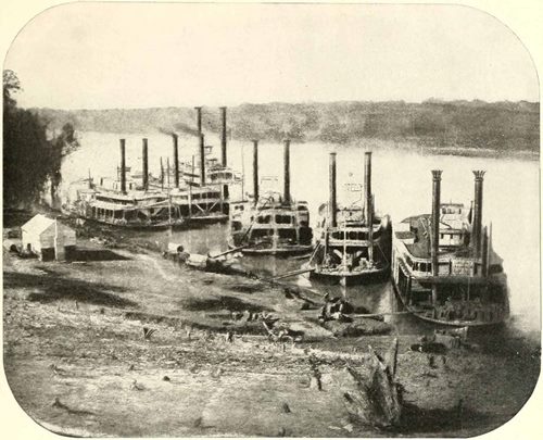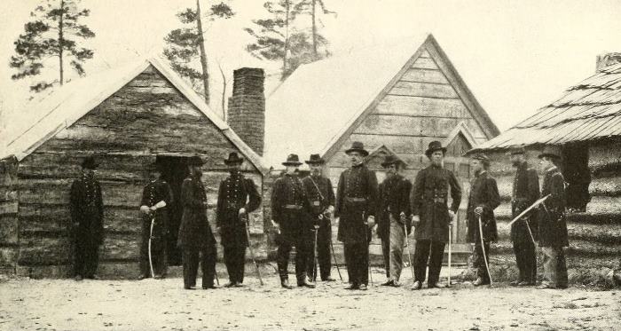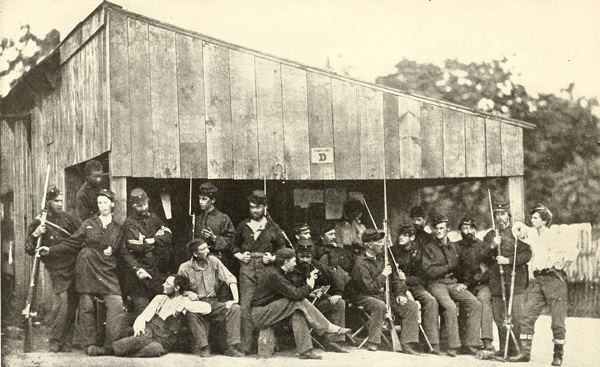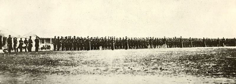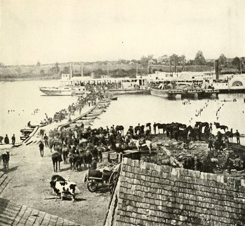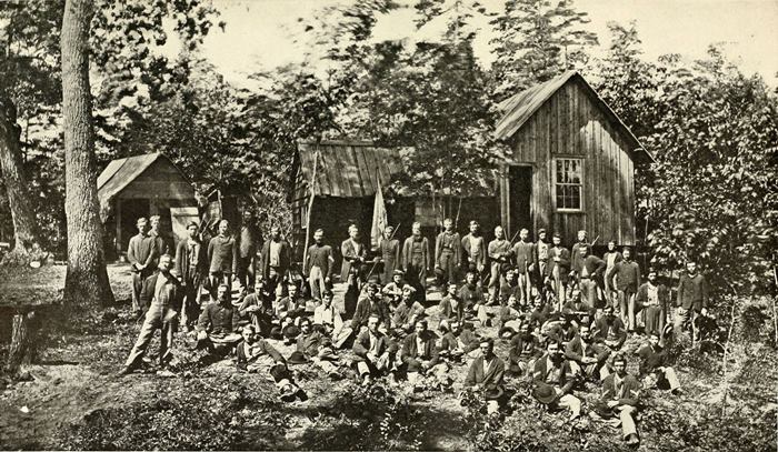 When Thomas began to draw together his forces to meet Hood at Nashville, he ordered the garrison at Johnsonville, on the Tennessee, eighty miles due west of Nashville, to leave that place and hasten north. It was the garrison at this same Johnsonville that, a month earlier, had been frightened into panic and flight when the bold Confederate raider, Forrest, appeared on the west bank of the river and began a noisy cannonade. New troops had been sent to the post. They appear well coated and equipped. The day after the photograph was taken (November 23d) the encampment in the picture was broken.