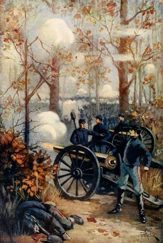 In vain McDowell and his officers attempted to rally his panic-stricken men and re-form his lines. Only the regulars,[Pg 20] about sixteen hundred in number, were subject to the orders of their superiors, and they made a brave stand against the oncoming foe while they covered the retreat of the disorganized mass. On the Henry hill were the two powerful batteries of Griffin and Ricketts. They had done most valiant service while the tide of battle ebbed and flowed. But at last their hour had come. A Confederate regiment, dashing from a neighboring hill, poured in a deadly volley, cut down the cannoneers almost to a man, killed their horses, and captured the guns. A few minutes later General Beauregard rode up to the spot and noticed Captain Ricketts lying on the ground, desperately wounded. The two men had been friends in the years gone by. Beauregard, recognizing his old friend, asked him if he could be of any service. He then sent his own surgeons to care for the wounded captain and detailed one of his staff to make him comfortable when he was carried to Richmond as a prisoner of war.