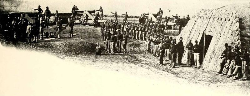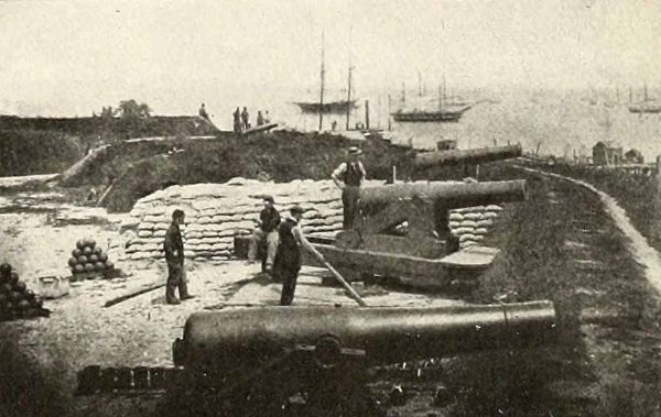 The upper photograph shows Confederates on Monday the fifteenth of April, 1861—one day after the momentous event which Holmes dimly prophesied in “Brother Jonathan” (page 44). The picture below, with the two following, were made on the 16th. As April wore on, North and South alike had been reluctant to strike first. When Major Robert Anderson, on December 26, 1860, removed to Fort Sumter, on an island at the entrance to Charleston Harbor, he placed himself in a position to withstand long attack. But he needed supplies. The Confederates would allow none to be landed. When at length rumors of a powerful naval force to relieve the fort reached Charleston, the Confederates demanded the surrender of the garrison. Anderson promised to evacuate by April 15th if he received no additional supplies. His terms were rejected. At half-past four on the morning of April 12th a shell from Fort Johnson “rose high in air, and curving in its course, burst almost directly over the fort.” The mighty war had begun.