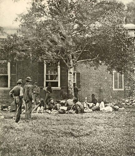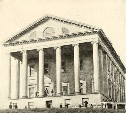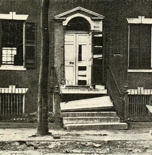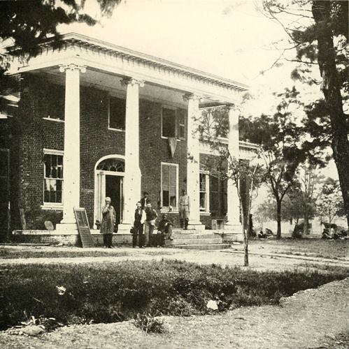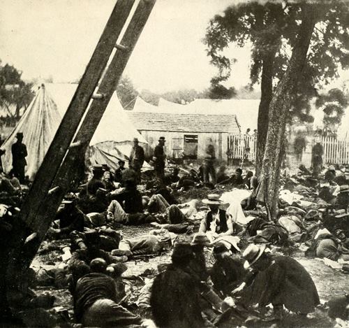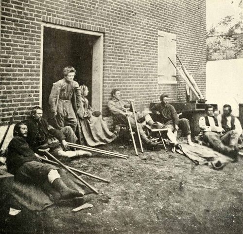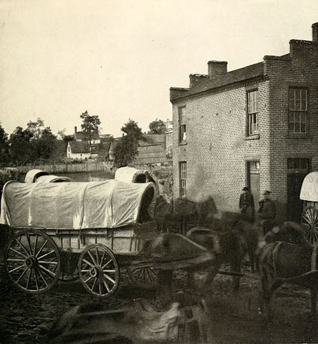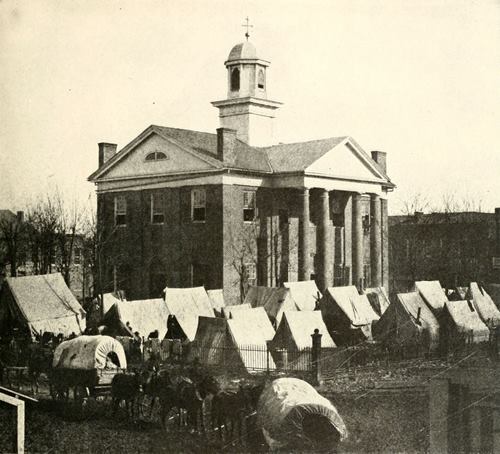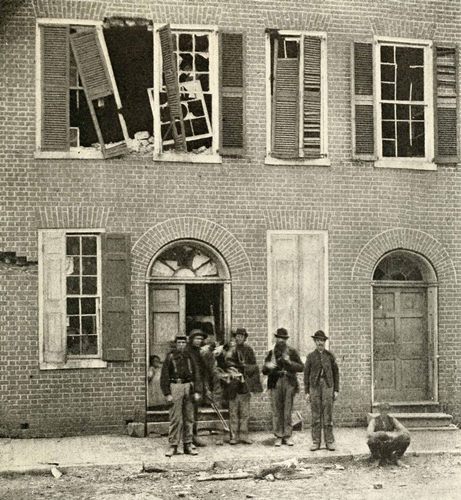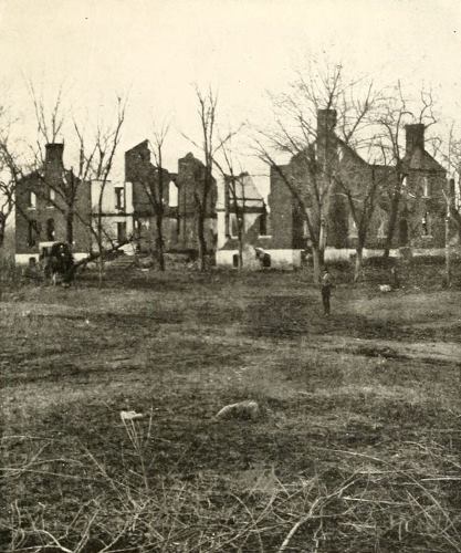 This beautiful old mansion on Bolingbroke Street could look back to the days of buckles and small clothes; it wears an aggrieved and surprised look, as if wondering why it should have received such buffetings as its pierced walls, its shattered windows and doorway show. Yet it was more fortunate than some of its near-by neighbors, which were never again after the visitation of the falling shells fit habitations for mankind. Many of these handsome residences were utterly destroyed, their fixtures shattered beyond repair; their wainscoting, built when the Commonwealth of Virginia was ruled over by the representative of King George, was torn from the walls and, bursting into flames, made a funeral pyre of past comforts and magnificence. The havoc wrought upon the dwellings of the town was heavy; certain localities suffered more than others, and those residents who seemed to dwell in the safest zones had been ever ready to open their houses to the sick and wounded of Lee’s army. As Grant’s troops marched in, many pale faces gazed out at them from the windows, and at the doorsteps stood men whose wounds exempted them from ever bearing arms again.