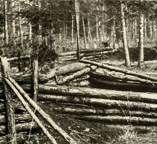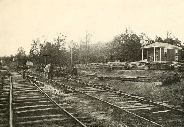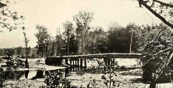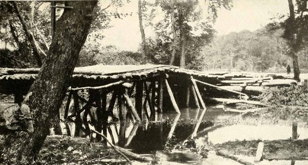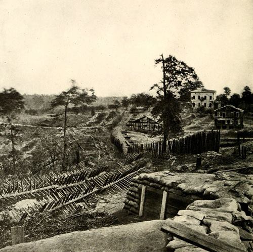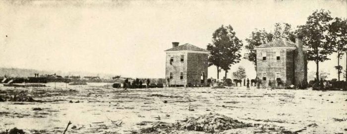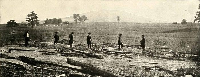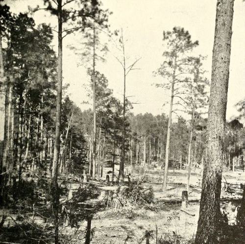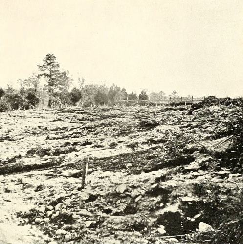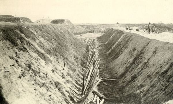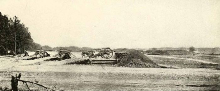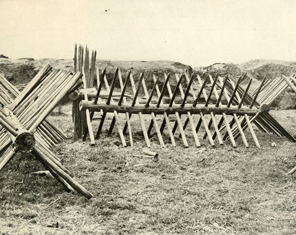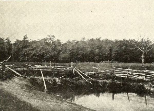 These well-made protections of sharpened spikes, as formidable as the pointed spears of a Roman legion, are chevaux-de-frise of the Confederates before their main works at Petersburg. They were built after European models, the same as employed in the Napoleonic wars, and were used by both besiegers and besieged along the lines south of the Appomattox. Those shown in this picture were in front of the entrenchments near Elliott’s salient and show how effectually it was protected from any attempt to storm the works by rushing tactics on the part of the Federal infantry. Not far from here lies the excavation of the Crater.
