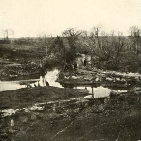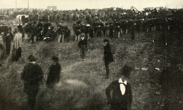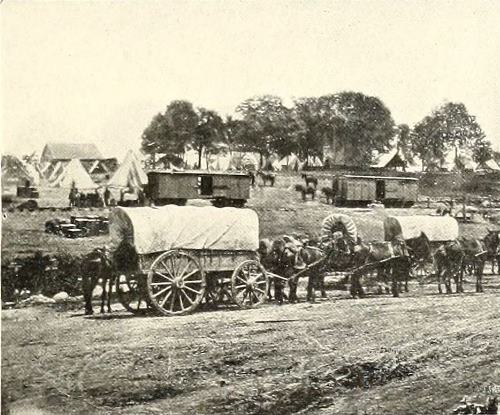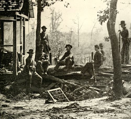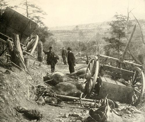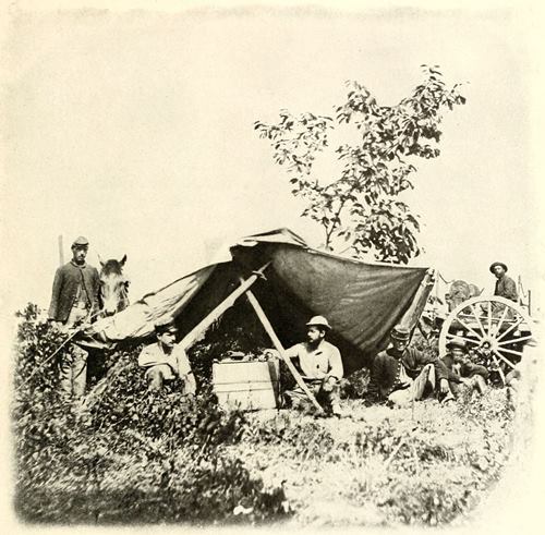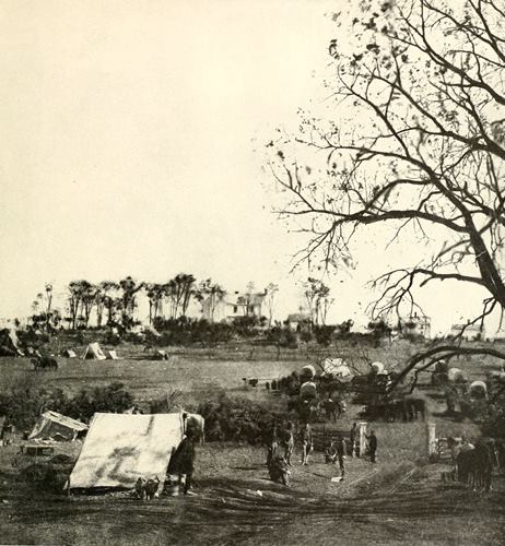 Camp-fires were still smouldering along the side of the abatis where the lens caught the field of Nashville, while Thomas’ concentric forward movement was in progress. Note the abatis to the right of the picture, the wagons moving and ready to move in the background, and the artillery on the left. White tents gleam from the distant hills. A few straggling soldiers remain. The Federals are closing with Hood’s army a couple of miles to the right of the scene in the picture.