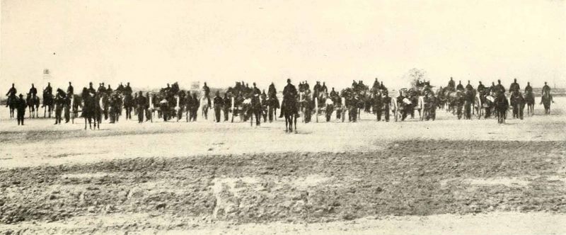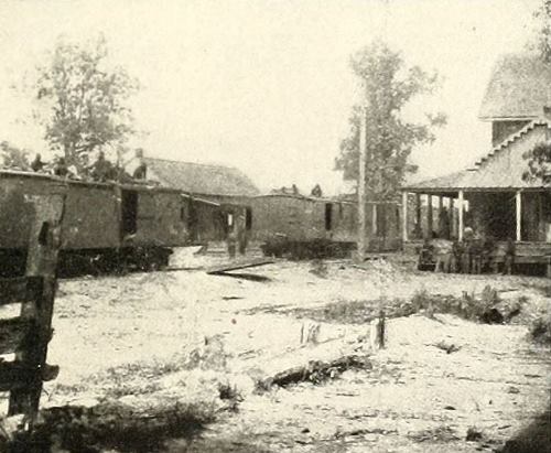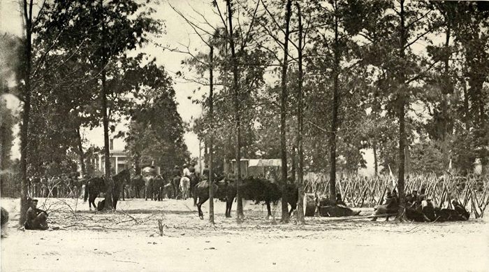 At this railroad point, three miles from the Court House, a Confederate provision train arrived on the morning of April 8th. The supplies were being loaded into wagons and ambulances by a detail of about four thousand men, many of them unarmed, when suddenly a body of Federal cavalry charged upon them, having reached the spot by a by-road leading from the Red House. After a few shots the Confederates fled in confusion. The cavalry drove them on in the direction of Appomattox Court House, capturing many prisoners, twenty-five pieces of artillery, a hospital train, and a large pack of wagons. This was Lee’s last effort to obtain food for his army.
