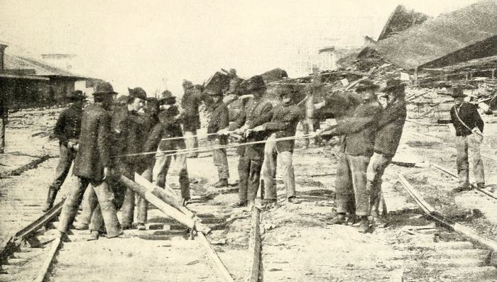 When the Union army entered the city in the morning, thousands of the inhabitants, men, women, and children, were gathered at street corners and in the parks, in wildest confusion. The commissary depot had been broken open by the starving mob, and rifled of its contents, until the place was reached by the spreading flames. The Federal soldiers stacked arms, and heroically battled with the fire, drafting into the work all able-bodied men found in the city. The invaders extinguished the flames, and soon restored the city to a state of order and safety. The invalid wife of General Lee, who was[Pg 532] exposed to danger, was furnished with an ambulance and corporal’s guard until the danger was past.