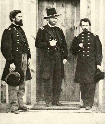 No photographer was present at Appomattox, that supreme moment in our national history, when Americans met for the last time as foes on the field. Nothing but fanciful sketches exist of the scene inside the McLean home. But here is a photograph that shows most of the Union officers present at the conference. Nine of the twelve men standing above stood also at the signing of Lee’s surrender, a few days later. The scene is City Point, in March, 1865. Grant is surrounded by a group of the officers who had served him so faithfully. At the surrender, it was Colonel T. S. Bowers (third from left) upon whom Grant called to make a copy of the terms of surrender in ink. Colonel E. S. Parker, the full-blooded Indian on Grant’s staff, an excellent penman, wrote out the final copy. Nineteen years later, General Horace Porter recorded with pride that he loaned General Lee a pencil to make a correction in the terms. Colonels William Duff and J. D. Webster, and General M. R. Patrick, are the three men who were not present at the interview. All of the remaining officers were formally presented to Lee. General Seth Williams had been Lee’s adjutant when the latter was superintendent at West Point some years before the war. In the lower photograph General Grant stands between General Rawlins and Colonel Bowers. The veins standing out on the back of his hand are plainly visible. No one but he could have told how calmly the blood coursed through them during the four tremendous years.