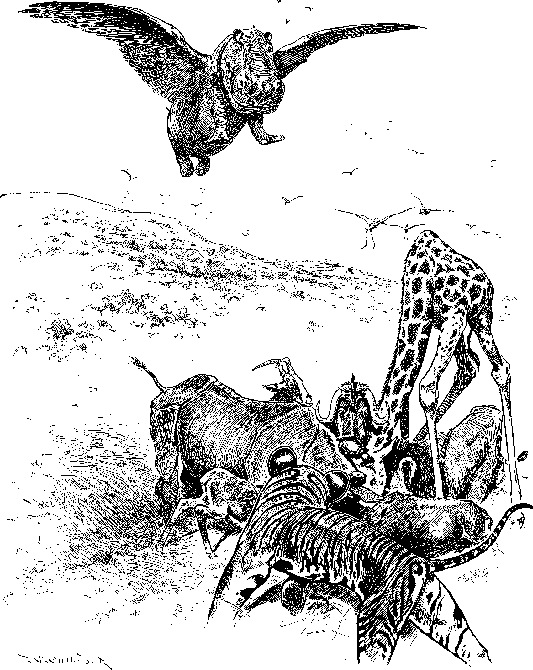 "What a horrid sight!" he said. "But let us be thankful that the pink-and-green elephant and the feathered hippopotamus are not also in evidence."