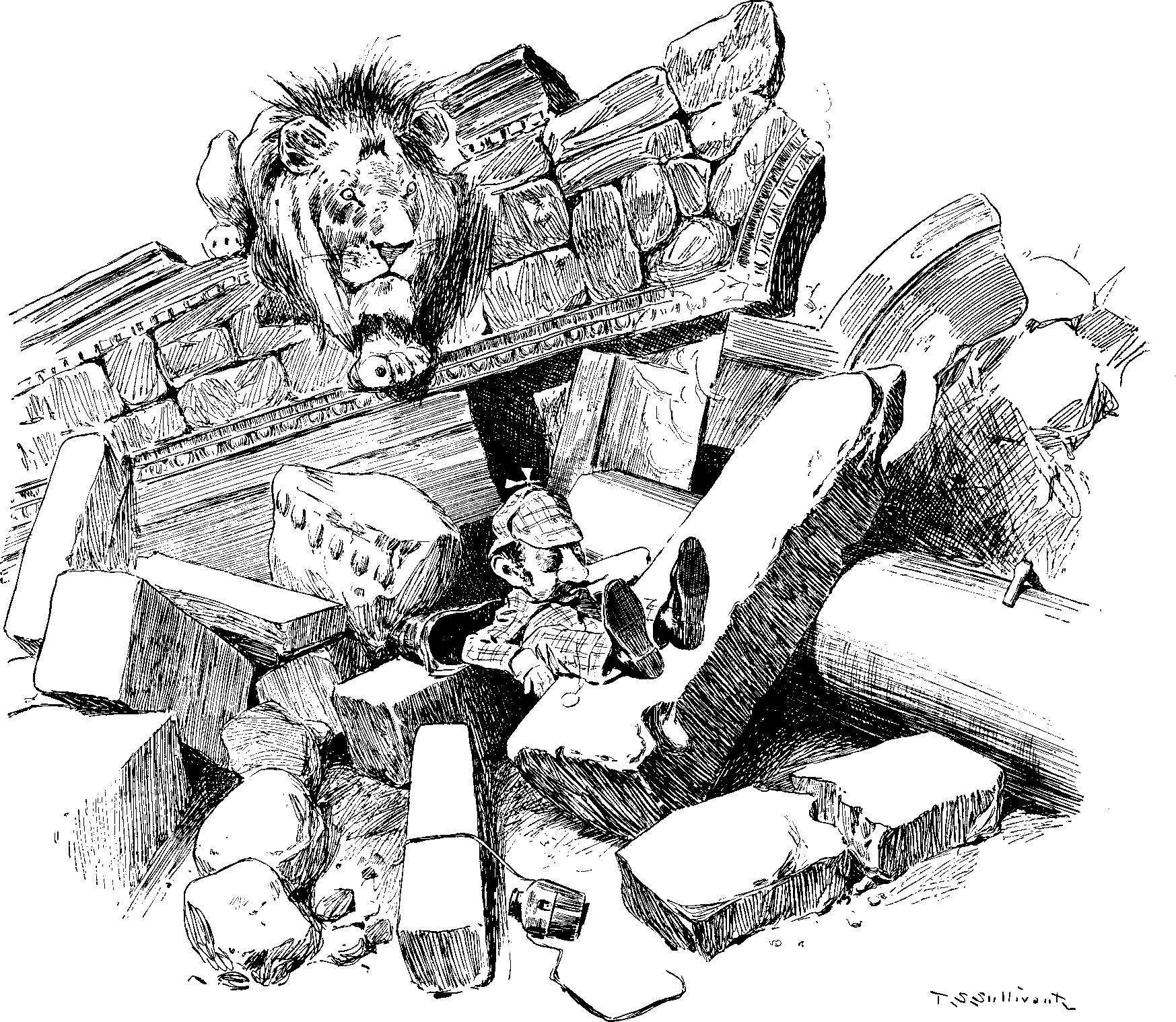 As the man picked himself out of the jumbled-up ruins into the dust-filled air, he encountered a lion who had lost his tail and his temper in the mélée.