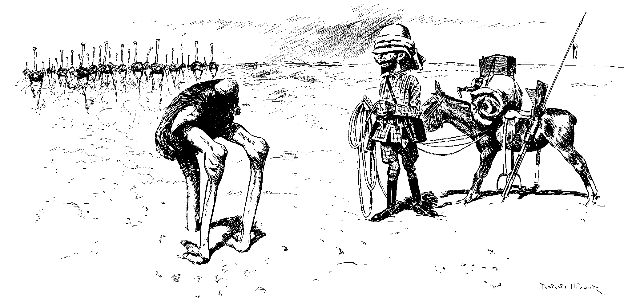 "Ah! ah!" exulted the hunter, "I have the silly thing at last." He advanced to place a rope around the bird's legs; but the ostrich, who had accurately timed his arrival, landed a kick in the pit of his stomach that sent him into the hereafter like a bullet through a fog-bank.