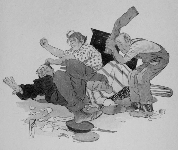 “‘The lady, who was a stout-built female something under six feet, had a little dark-complected man under the crook of her arm, and whilst she spanked him with the stove-lid she hollered “Help!” and “Murder!” That poor little—I mean to say, that scoundrel—had kicked over most of the truck that was252 movable, the cat and dog was gobblin’ what would have been breakfast if this unhappy dispute hadn’t come about, and they was growling and snapping and spitting, too.