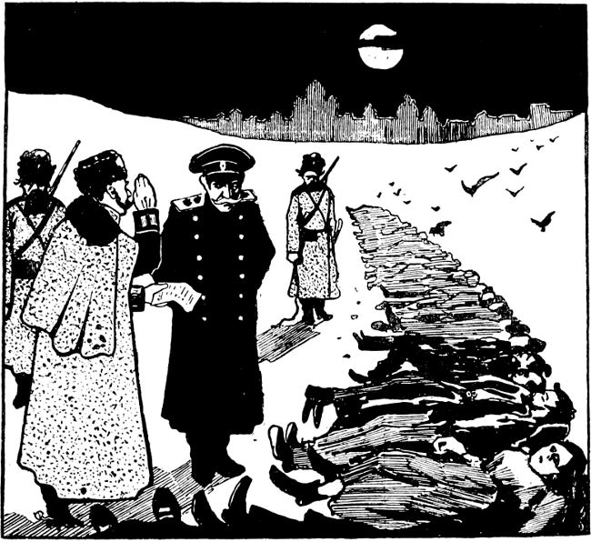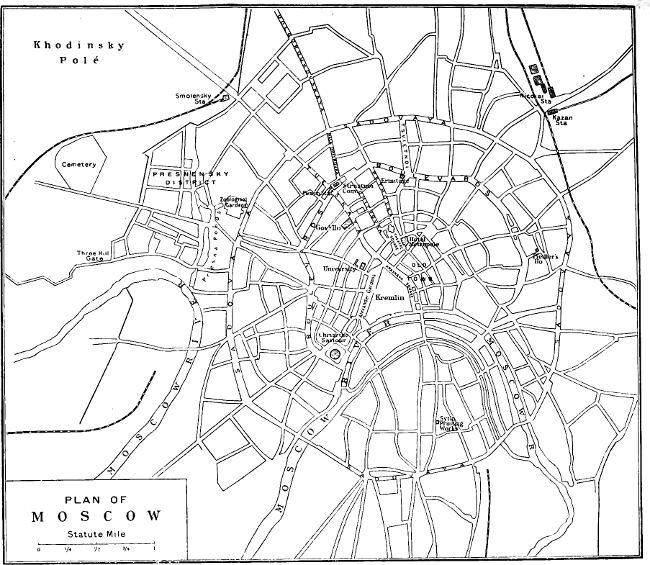 | The beginning of the end—My attempts at photography—Unsuspected presence of revolutionists—Search for revolvers—Labels for identification—Fresh fighting on the Government’s left—But the main movement was failing—Revolutionists appeal for volunteers—Official estimate of casualties—Assassination of the chief of secret police—The Sadovaya at dawn—The police receive rifles—The barricades destroyed—Business resumed by order—Relief of business people—Fighting continues in Presnensky District—Mills held for the revolution—Arrival of the Semenoffsky Guards—Bombardment of the district—The murder of Dr. Vorobieff for assisting the wounded—The district from the inside—Attempts to escape—End of the rising—Various estimates of dead and wounded—The executions—The slaughter of prisoners—The flogging of boys and girls—Christmas Day—The ceremony in the Cathedral of Christ the Saviour | 169 |