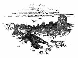 The horse too tries to raise himself: frequently he rises for a moment, but then a ghastly sight strikes the eye. From his torn belly hangs a whole bundle of intestines with a rosy spleen, bluish liver, and greenish stomach. The hapless beast tries to walk a few steps; but his trembling feet tread on his own entrails, he falls, digs the ground with his hoofs, shudders. Meanwhile the attendants run up, remove the saddle and bridle, and finish the torments of[229] the horse with one stab of a stiletto, at the point where head and neck come together.