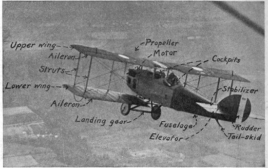 21Construction of the Airplane.—The modern airplane (Fig. 1) consists of one or more planes, much longer across than in the direction of flight (aspect ratio). These are inclined slightly upward toward the direction of travel, and their rapid motion through the air, due to the pull of the propeller driven by the motor, causes them to rise from the earth, carrying the fuselage or body of the airplane. In the fuselage are carried the pilot, observer, and any other load. Wheels below the fuselage forming the under-carriage or landing gear serve to support the body when running along the ground in taking off or landing. The pilot, sitting in one of the cockpits, has in front of him the controls, by means of which the motion of the plane is guided (Figs. 2 and 3). These consist of the engine controls—the contacts for the ignition, the throttle, the oil and gasoline supply, air pressure, etc., and the steering controls—the rudder bar, the stick and the stabilizer control. The rudder bar, operated by the feet, controls both the rudder of the plane, which turns the plane to right or left in the air, and the tail skid, for steering on the ground. The stick is a vertical column in front of the pilot which, when pushed forward or back, depresses or raises the elevator and makes the machine dive or climb. Thrown to either side it operates the ailerons or wing tips, which cause the plane to roll about its fore and aft axis. The stabilizer control is usually a wheel at the side of the cockpit, whose turning varies the angle of incidence of the small stabilizing plane in front of the elevator, to correct the balance of the plane under different conditions of loading.