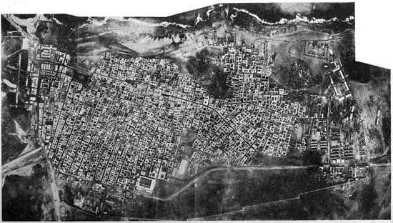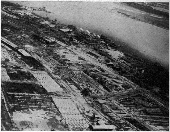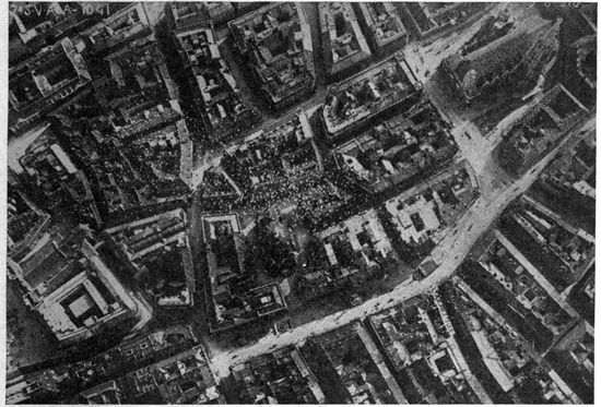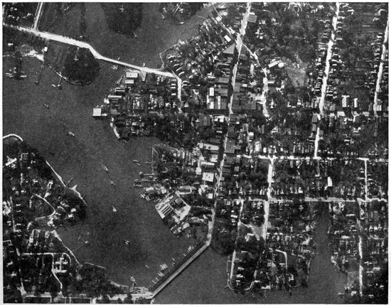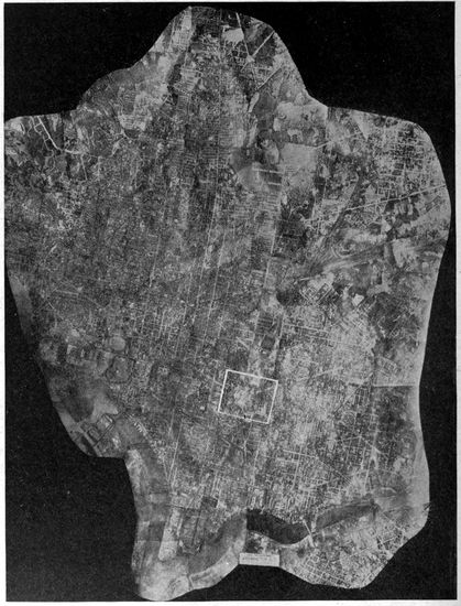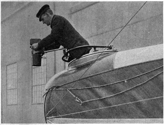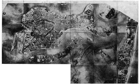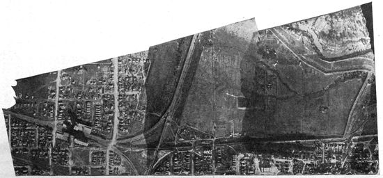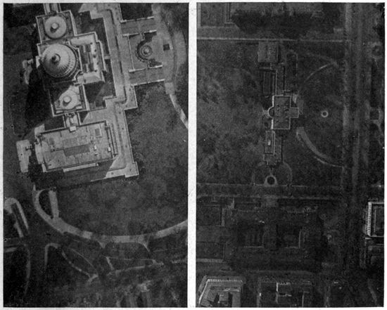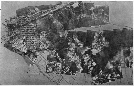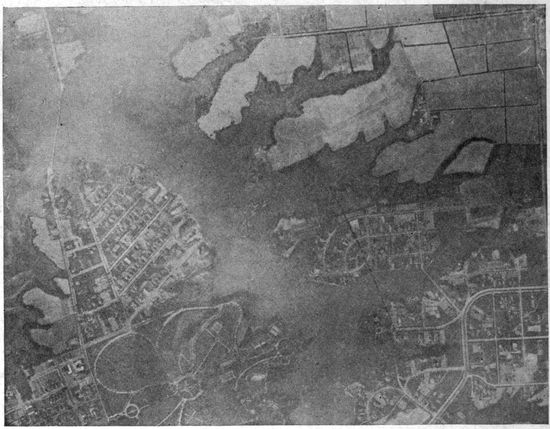 Aerial Photography from Balloons and Kites.—Photography from the air had been developed and used to a limited extent before the Great War, but with very few exceptions the work was done from kites, from balloons, and from dirigibles. Aerial photographs of European cities had figured to a small extent in the illustration of guidebooks, and some aerial photographic maps of cities had been made, notably by the Italian dirigible balloon service. Kites had been employed with success to carry cameras for photographing such objects as active volcanoes, whose phenomena could be observed with unique advantage from the air, and whose location was usually far from balloon or dirigible facilities.