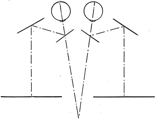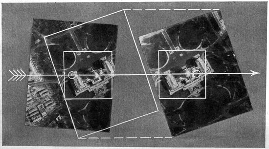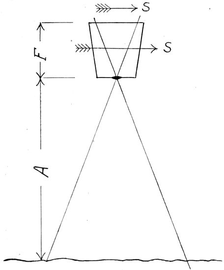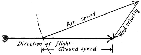 The direction and velocity of the wind must be carefully considered by the pilot in making any predetermined course or objective. The progress of the plane due to the pull of the propeller is primarily with reference to the air. If this is in motion the plane's ground speed and direction will be altered accordingly. In flying with or against the wind the ground speed is the sum or difference, respectively, of the plane's air speed (determined by an air speed indicator) and the speed of the wind. If the predetermined course lies more or less across the wind the plane must be pointed into the wind, in which case its travel, with respect to the earth, is not in the line of its fore and aft axis. The effect of “crabbing,” as it is called, on photographic calculations is discussed later (Figs. 136 and 138).