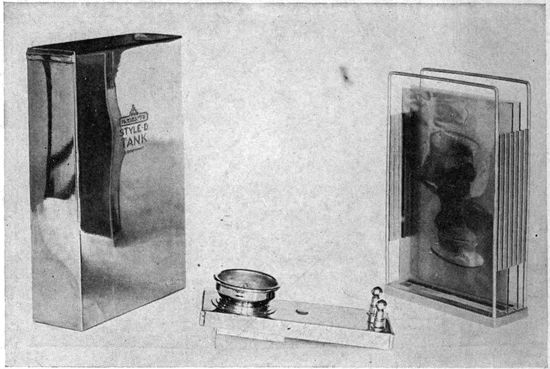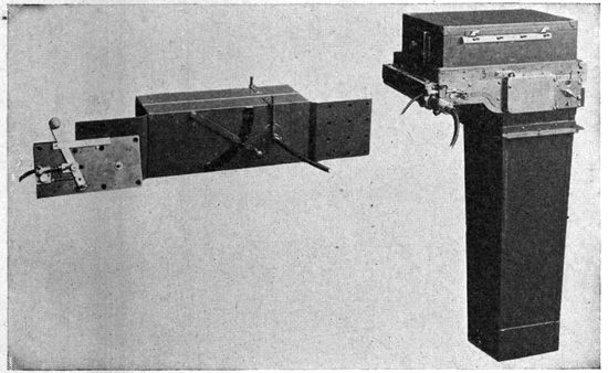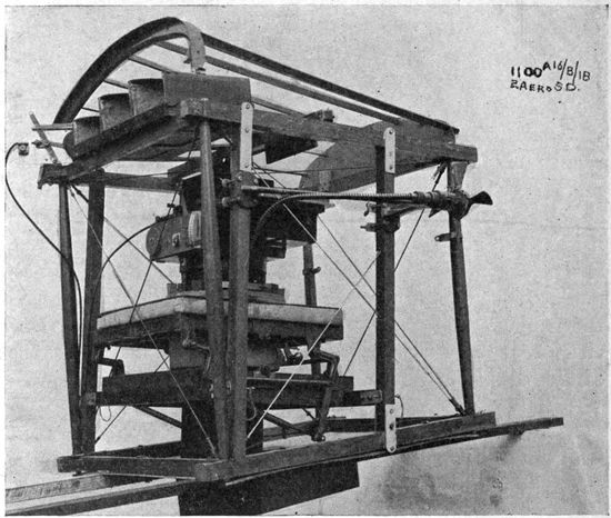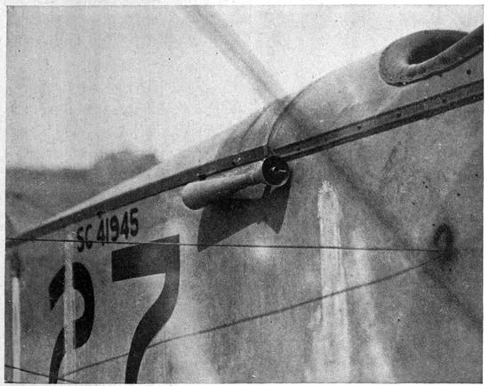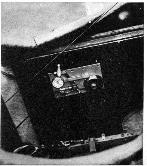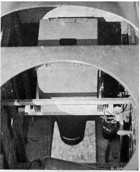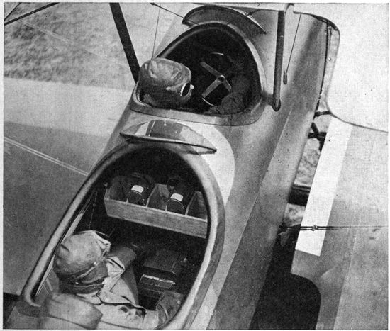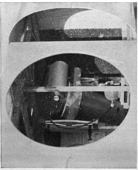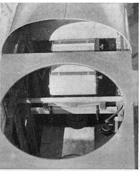 Chief among the war-time limitations is that of economy of space and weight. A war plane must carry a certain equipment of guns, radio-telegraphic apparatus and other instruments, all of which must be readily accessible. Many 19planes have duplicate controls in the rear cockpit to enable the observer to bring the plane to earth in case of accident to the pilot. Armament and controls demand space which must be subtracted from quarters already cramped, so that in most designs of planes the photographic outfit must be accommodated in locations and spaces wretchedly inadequate for it. Economy in weight is pushed to the last extreme, for every ounce saved means increased ceiling and radius of action, a greater bombing load, more ammunition, or fuel for a longer flight. Hence comes the constant pressure to limit the weight of photographic and other apparatus, even though the tasks required of the camera constantly call for larger rather than smaller equipment.