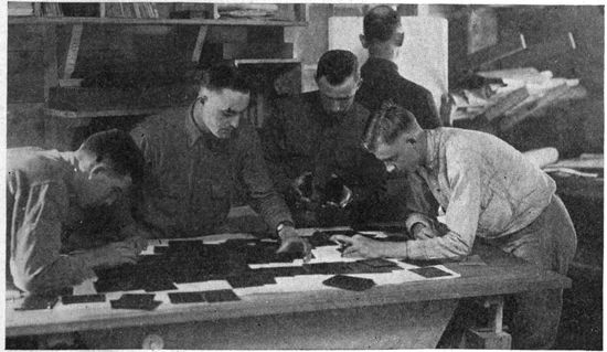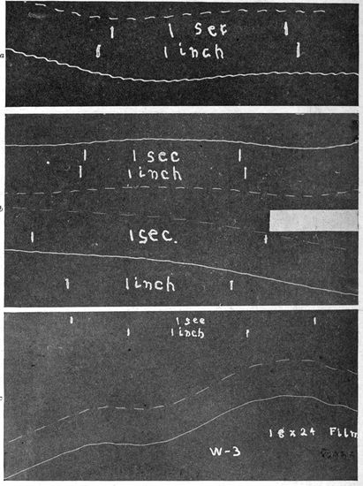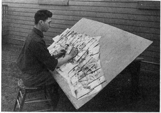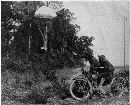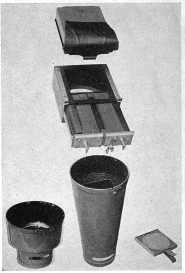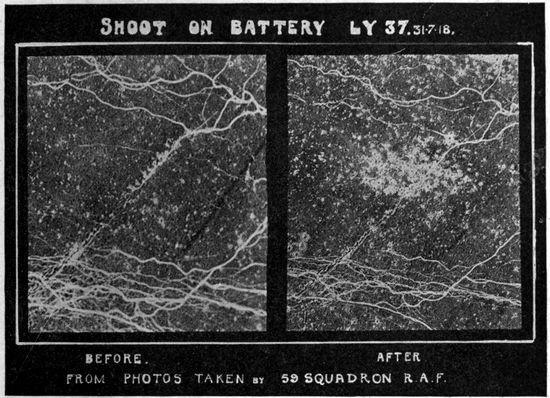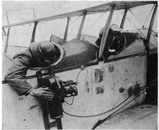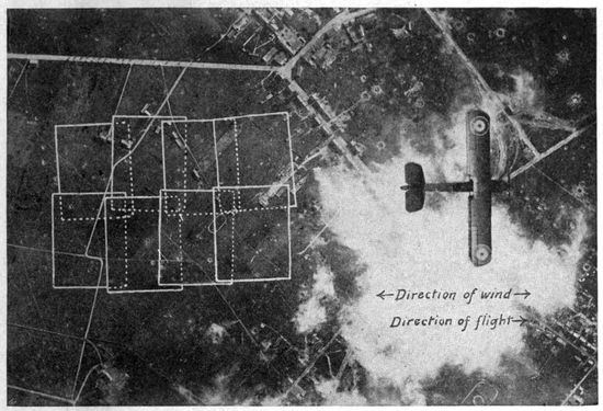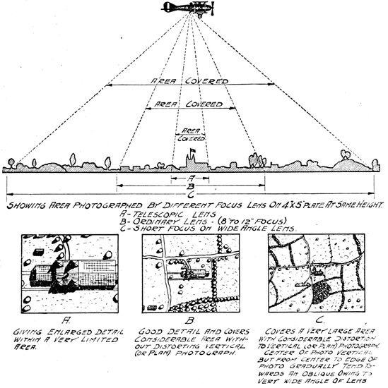 In the early days of the war, observation was visual. It was the task of the observer in the plane to sketch the outlines of trenches, to count the vehicles in a transport train, to estimate the numbers of marching men, to record the guns in an artillery emplacement and to form an idea of their size. But the capacity of the eye for including and studying all the objects in a large area, particularly when moving at high speed, was soon found to be quite too small to properly utilize the time and opportunities available in the air. Moreover, the constant watching of the sky for the “Hun in the sun” distracted the observer time and time again from attention to the earth below. Very early in the war, therefore, men's minds turned to photography. The all-seeing and recording eye of the camera took the place of the observer in every kind of work except artillery fire control and similar problems which require immediate communication between plane and earth.