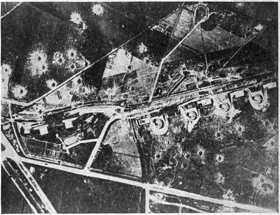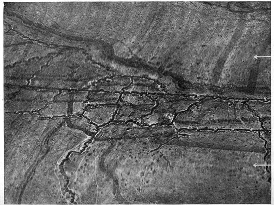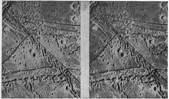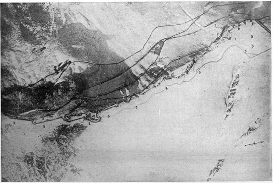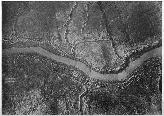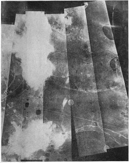 The volume of work done by the photographic sections of the military air service steadily increased until toward the end of the war it became truly enormous. The aerial negatives made per month in the British service alone mounted into the scores of thousands, and the prints distributed in the same period numbered in the neighborhood of a million. The task of interpreting aerial photographs became a highly specialized study. An entirely new activity—that of making photographic mosaic maps and of maintaining them correct from day to day—usurped first place among topographic problems. By the close of the war 18scarcely a single military operation was undertaken without the preliminary of aerial photographic information. Photography was depended on to discover the objectives for artillery and bombing, and to record the results of the subsequent “shoots” and bomb explosions. The exact configurations of front, second, third line and communicating trenches, the machine gun and mortar positions, the “pill boxes,” the organized shell holes, the listening posts, and the barbed wire, were all revealed, studied and attacked entirely on the evidence of the airplane camera. Toward the end of the war important troop movements were possible only under the cover of darkness, while the development of high intensity flashlights threatened to expose even these to pitiless publicity.