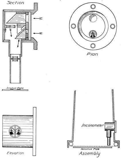 35Inclinometers for showing the lateral and fore and aft angle of the plane with the horizontal, are occasionally used, and have also been incorporated in cameras. The important point to remember about these instruments is that they are controlled not alone by gravity but as well by the acceleration of the plane in any direction. They consequently indicate correctly only when the plane is flying straight. On a bank the lateral indicator continues to indicate “vertical” if the bank is properly calculated for the turn.