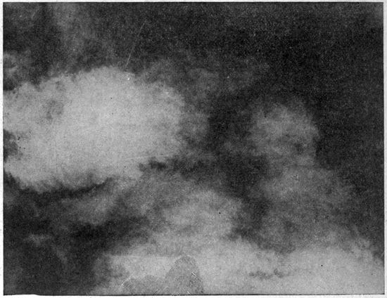As the gaze is directed away from the territory directly below, the thickness of atmosphere to be pierced rapidly increases, until toward the horizon (which lies level with the observer here as on the ground) all detail is apt to be obliterated to such an extent that only on very clear days can the horizon itself be definitely found or be distinguished from low lying haze or clouds (Fig. 4).