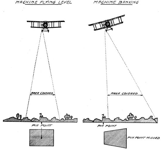 Limitations to Airplane Photography Set by War Conditions.—The ability of the pilot to take the modern high-powered plane over any chosen point at any desired altitude in almost any condition of wind or weather gives to the plane an essential advantage over the photographic kites and balloons of pre-war days. There are, however, certain disadvantages in the use of the plane which must be overcome in the design of the photographic apparatus and in the method of its use. Some few of these disadvantages are inherent in the plane itself; for instance, the necessity for high speed in order to remain in the air, and the vibration due to the constantly running engine. Others are peculiar to war conditions, and their elimination in planes for peace-time photography will give great opportunities for the development of aerial photography as a science.
