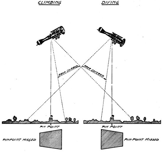 When he reaches the desired altitude the pilot levels off the plane and ceases to climb. Now his task is to maintain the plane on an even keel by means of the controls, correcting as soon as he notes it, any tendency to “pitch,” to “roll” or to “yaw” off the course. The resultant path is one which approximates to level straight flying to a degree conditioned by the steadiness of the air and the skill of the pilot. If he is not skilful or quick in his reactions he may keep the plane on its level course only by alternately climbing and gliding, by flying with first one wing down and then the other, by pointing to the right and then to the left. The skilled photographic pilot will hold a plane level in both directions to within a few degrees, but he will do this easily only if the plane is properly balanced. If the load 27on the plane is such as to move the center of gravity too far forward with respect to the center of lift the plane will be nose-heavy, if the load is too far back it will be tail-heavy. Either of these conditions can be corrected, at some cost in efficiency, by changing the inclination of the stabilizer. When the plane reaches high altitudes in rare air, where it can go no further, it is said to have reached its ceiling. It here travels level only by pointing its wings upward in the climbing position, so that the fuselage is no longer parallel to the direction of flight. An understanding of these peculiarities of the plane in flight is of prime importance in photographic map making, where the camera should be accurately vertical at all times.