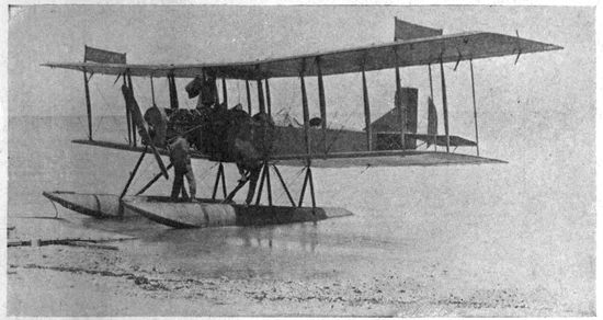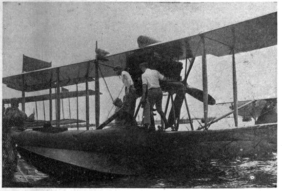 Types of Planes.—The most common type of plane is the biplane (Fig. 4), with its two planes, connected by struts and wires, set not directly over each other, but staggered, usually with the upper plane leading. Monoplanes were in favor in the early days of aviation, and triplanes have been used to some extent. According to the position of the propeller planes are classified as tractors or pushers, tractors being at present the more common form. Planes are further classified as single-seaters (Fig. 5), two-seaters, and three-seaters. These motor and passenger methods of classification are now proving inadequate with the rapid development of planes carrying two, three, and even more motors, divided between pusher and tractor operation, and carrying increasingly large numbers of passengers. Aside from structure, planes may be further classified according to their uses, as 25scout, combat, reconnaissance, bombing, etc. Planes equipped with floats or pontoons for alighting on the water are called seaplanes (Fig. 182), and those in which the fuselage is boat-shaped, to permit of floating directly on the water, are flying boats (Fig. 183).