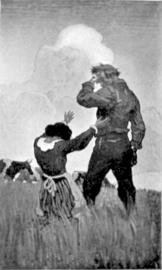 As the children went out of sight, a strange and awful change came over the face of nature. The bright sun was blotted out as it touched the edge of that rising belt of indigo blue. This blanket of cloud, like a curtain with puckering strings to bring it together in the southeast, drew fast across the sky--very, very fast, considering that there was not a breath of wind stirring. It was a fearful thing to see, the blue-black cloud hurrying up the sky, over the sky, and far down until there was no bright spot except a narrowing oval near the southeastern horizon; and not a breath of wind. The storm was like a leaning wall, that bent far over us while its foot dragged along the ground, miles and miles behind its top. Everything had a tinge of strange, ghastly greenish blue like the face of a corpse, and it was growing suddenly dark as if the day had all at once shut down into dusk.
