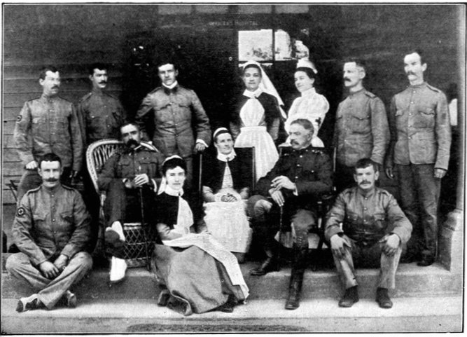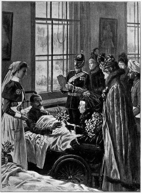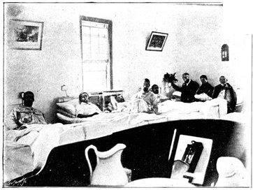 HER MAJESTY THE QUEEN VISITING HER WOUNDED SOLDIERS.The Queen has throughout the war shown the greatest solicitude for the wounded. On March 22, 1900, Her Majesty paid a visit to the Herbert Hospital at Woolwich, and personally handed gifts of flowers to over a hundred wounded men, in each case accompanying the gift with a few words of sympathy, which often had reference to the services of the particular man whom she addressed. The patients included survivors from Colenso, Spion Kop, &c. The Irish soldiers, whose gallantry had been specially noteworthy, were favoured with special notice. The Queen was accompanied by the Princess Christian and the Princess Victoria of Schleswig-Holstein.
