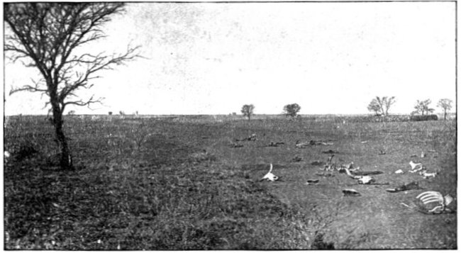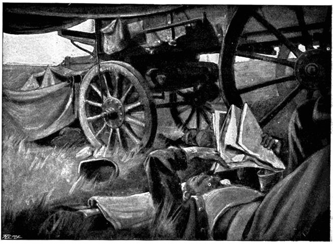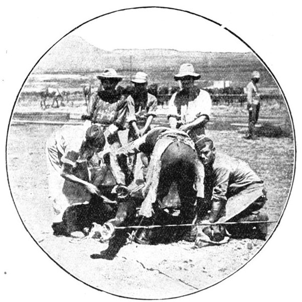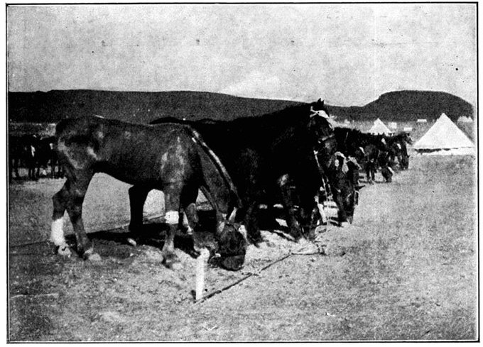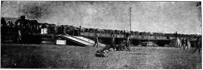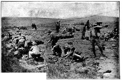 BETWEEN TWO FIRES: THE ENEMY'S AND THE BURNING VELDT.Laying a field cable as it advanced, the Cavalry Division turned on its northward sweep, and soon after noon sundered the telegraph wires which connected Jacobsdal with Bloemfontein. Patrols were pushed out towards Jacobsdal and ascertained that this place was held in no great strength. At Wegdraai was a splendid well full of cool water, but the orders were peremptory that it was to be left for the Sixth Division, and so, notwithstanding heat and thirst, the column had to move on, though this was the only well on the arid plain between the Riet and Modder. The horses now began to show signs of great suffering, as well the poor beasts might, for there was neither shade nor verdure to break the intensity of the heat and vary the monotony of the dull brown steppe. The veldt grass was parched and brown—as brown as the veldt itself—and presently, some troopers, dropping matches in it as they passed, set it ablaze. A great sheet of flame swept with the wind behind the cavalry, but as the men rode faster than the fire could travel, little heed was paid to the conflagration. By this fire the field telegraph was destroyed and communication with Lord Roberts lost, while the heat and smoke it caused were further sources of trial. It was only because the Boers offered no serious resistance that the results were not far worse. At one point the scouts were suddenly driven in, and almost without notice heavy firing broke out. The British line was taken between two fires, and choosing to perish by the shots[Pg 352] of the Boers rather than in the flames, dashed forward, when the enemy fled; but for some instants matters looked critical. The front covered by the cavalry as it went forward was one of enormous extent. "From flank to flank," wrote Captain Boyle, a Yeomanry officer with General French's headquarters, "the distance was so great that at times the General's gallopers could not move their horses out of a walk, though the message was important." Horses were dropping out right and left, the artillery in especial suffering.