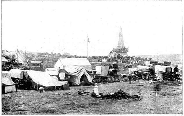 As General French's cavalry bivouacked for the night on the banks of the Modder, a tremendous dust storm swept over the country, hiding every feature from sight. Under cover of it the Boers must have moved down, for when night fell their pickets were in touch with ours on the north bank of the river. As it was vital to economise supplies, the cavalrymen were rationed from the cattle captured in the Boer laagers. It was decided to rest all the 14th for two reasons—because the horses were exhausted, and because it was considered necessary that the infantry should arrive and hold the drift before the cavalry left for Kimberley. Meantime the soldiers rioted on the hot bread, poultry, and fruit captured in the Boer camps, bathed in the river, and examined the strong position at the drift, which the Boers had so unaccountably abandoned. A good deal of skirmishing went on all day; the Boers brought up guns and shelled one of the British camps on the north of the stream, but were driven off by the Horse Artillery. It was clear that they were becoming uneasy as to their communications; but Cronje delayed and hesitated, and that day's indecision destroyed him.